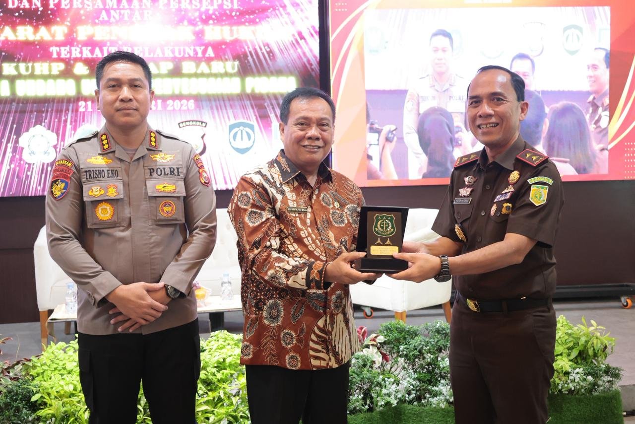Bengkulu, – Kejaksaan Tinggi (Kejati) Bengkulu menggelar kegiatan sinergitas penguatan pemahaman serta penyamaan persepsi antar Aparat Penegak Hukum (APH) terkait pemberlakuan Kitab Undang-Undang Hukum Pidana (KUHP) dan Kitab Undang-Undang Hukum Acara Pidana (KUHAP) yang baru, termasuk undang-undang penyesuaian pidana, Rabu (21/1/2026).