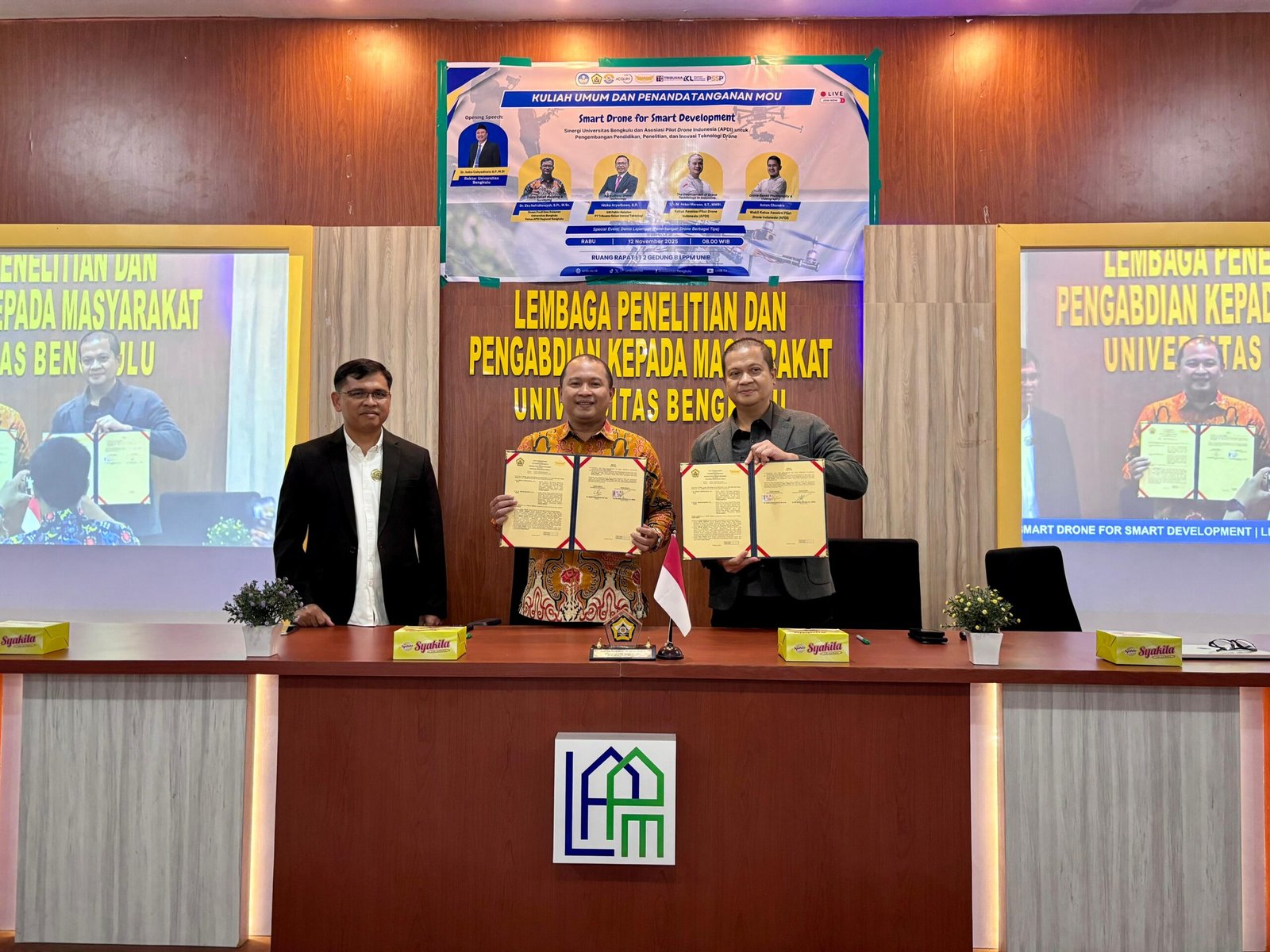 Bengkulu, – Universitas Bengkulu menjalin kerja sama strategis dengan Asosiasi Pilot Drone Indonesia (APDI) melalui penandatanganan Nota Kesepahaman (MoU) yang dirangkaikan dengan Kuliah Umum bertema “Smart Drone for Smart Development”, Rabu, 12 November 2025, di Gedung B LPPM Universitas Bengkulu. Kegiatan ini diikuti hampir 100 peserta, terdiri atas mahasiswa lintas program studi, perwakilan APDI Regional Bengkulu, dan tim PT Tribuana Solusi Inovasi Teknologi.