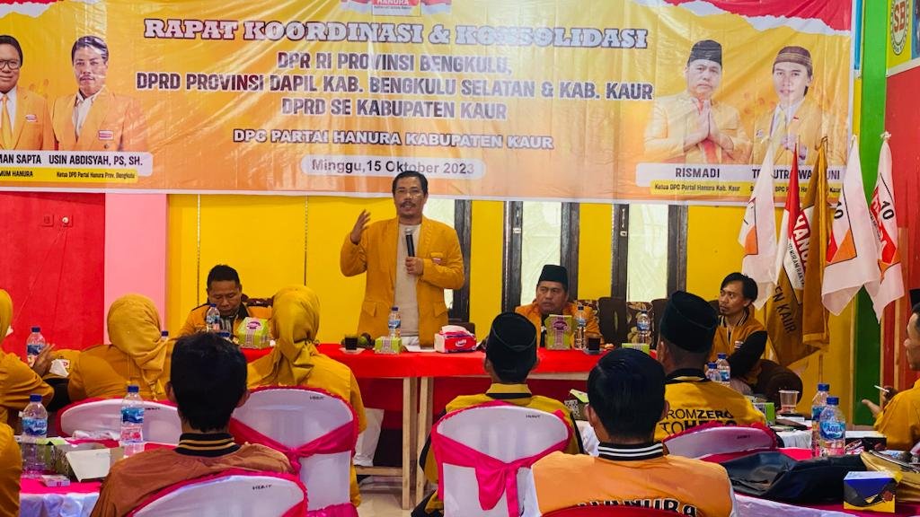 Kaur, – Orasi kemenangan partai Hanura Bergemuruh pada acara Rapat Koordinasi dan Konsolidasi partai Hanura di Kabupaten Kaur, Minggu 15 Oktober 2023. Yang dihadiri langsung oleh ketua DPD Partai Hanura Usin Abdisyah Putra Sembiring dan ketua DPC Partai Hanura Kabupaten Kaur Rismadi yang juga anggota Komisi I DPRD Kaur, Sekretaris DPC Partai Hanura Kabupaten Kaur Tri Putra Wahyuni yang juga Anggota Komisi II DPRD Kaur, Caleg DPR-RI Hanura Yudi Nugroho, Para Caleg Provinsi dan Kabupaten, serta para Kader Partai Hanura Daerah Pemilihan Kabupaten Kaur.