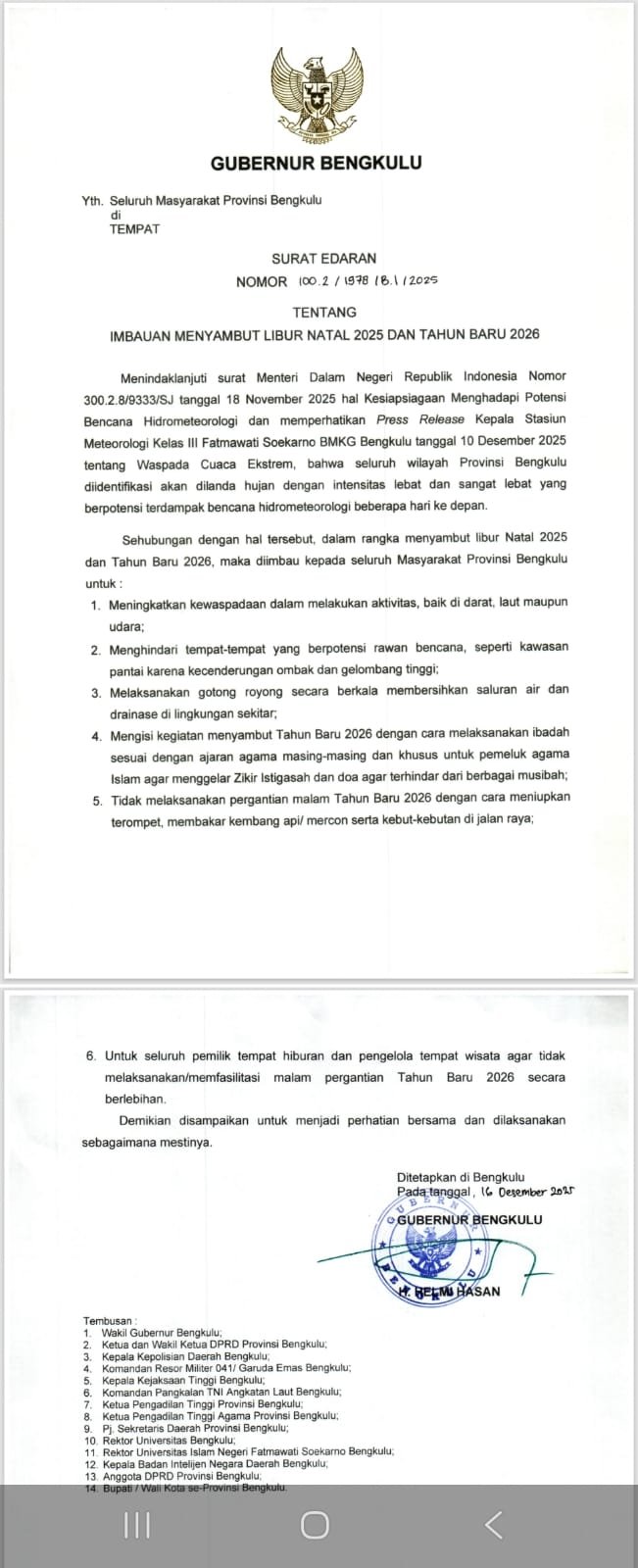 Bengkulu, – Gubernur Bengkulu Helmi Hasan menerbitkan Surat Edaran tentang imbauan menyambut libur Natal 2025 dan Tahun Baru 2026. Imbauan ini ditujukan kepada seluruh masyarakat Provinsi Bengkulu guna meningkatkan kewaspadaan menghadapi potensi bencana hidrometeorologi.