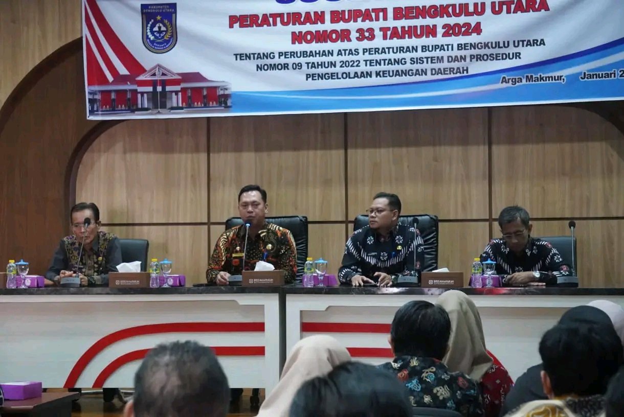 Bengkulu Utara, – Pemerintah Kabupaten (Pemkab) Bengkulu Utara (BU) dalam hal ini Badan Keuangan dan Aset Daerah (BKAD) melaksanakan sosialisasi mengenai Peraturan Bupati BU nomor 33 tahun 2024 terkait perubahan atas peraturan Bupati nomor 09 tahun 2022 tentang Sistem dan Prosedur Pengelolaan Keuangan Daerah, di Ruang Pola BKAD. Kamis (23/1/2025).